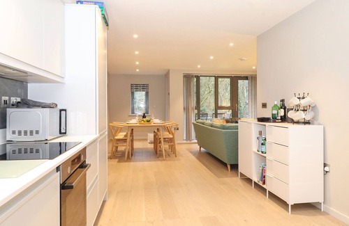 The living areas in this duplex apartment consist of an open-plan living space with kitchen equipped with electric oven and hob, microwave, fridge/freezer, washing machine and a dishwasher, a dining area with seating for four guests and a sitting area with Smart TV. The bedrooms consist of a king-size with en-suite shower room and a double with balcony with furniture, along with a bathroom. Outside there is a patio with furniture, as well as off-road parking for two cars. Within 5.7 miles you will find a shop, within 0.6 miles, a pub and within 0.8 miles, a river and please note that this is a non-smoking property. WiFi, fuel, power, bed linen and towels are all included in the price.