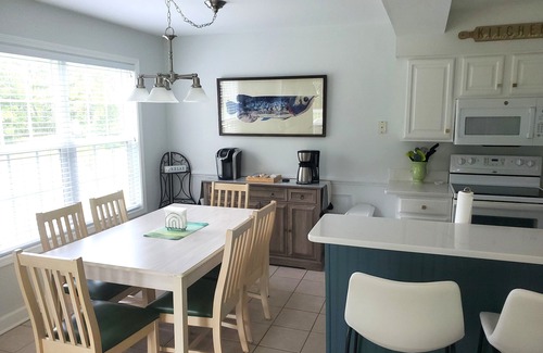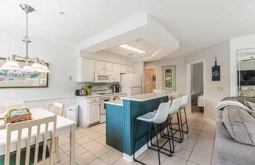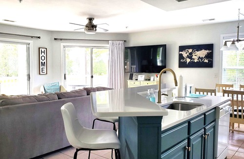 Experience our second-floor villa overlooking the fairway of the 1st hole at Brunswick Plantation Golf Resort in Calabash, NC. This bright condo is nestled in a serene location, offering a balcony with tranquil fairway views -- a perfect spot to sit back and relax. Steps away, enjoy access to the island pool (Apr.-Oct.) and year round fitness center. This beautiful 24/7 gated golf resort features 27 holes of golf, walking trails, and 19th Hole Restaurant and Bar. Located 9 miles from Sunset Beach and near Ocean Isle, North Myrtle Beach, and Calabash's renowned seafood, this location also boasts easy access to 48 Myrtle Beach area golf courses within 20 miles. Inside, two spacious bedroom suites provide 2 queen beds each and private baths. A full kitchen, living room, dining area, and laundry room connect the suites, while a second suite offers a private entrance, with kitchenette, and the option to segregate from the main suite for privacy, making it an ideal accommodation for two families. Amenities include Internet / Wi-Fi; 3 flat screen Roku TVs with DirecTV Stream; Keurig Kcup machine; drip coffee maker; toaster, microwave, range, refrigerator w / icemaker; equipped kitchen; in-unit washer / dryer; iron and ironing board, bed linens and towels (beach and pool towels are not provided). STARTER AMOUNTS of K-cups, dishwasher soap, laundry pods, paper towels, and toiletries are provided. Note: We do not have carbon monoxide sensors in our home because we have no source of CO, whether from heating, cooking or hot water. We take your safety seriously. Note: There is an unfenced lake within 100 yards of the building.
