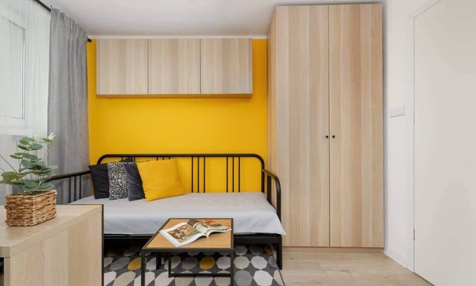 This tasteful studio is a cozy retreat designed for two people. It is an excellent choice for both business travelers and couples looking for an intimate atmosphere. The arrangement is dominated by gray and yellow, although black and beige accents also appear. In the living area, guests can enjoy a TV, a double sofa bed, as well as capacious cabinets for storing clothes and other small items. In the kitchen area there is a dining area and a place for preparing meals. Functional equipment allows convenient preparation of a variety of dishes and snacks. A shower is available in the bathroom to arrange a quick bath after a day's activities. You can also find a set of toiletries here. The interior is decorated in a modern and intriguing way, allowing you to enjoy your time in the apartment. The studio is located on the third floor of the building, which can be accessed by stairs. The cozy decor makes it a great vacation location and well worth a visit.