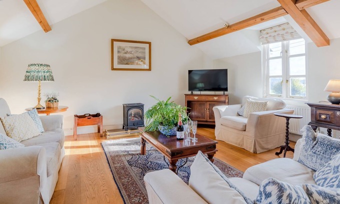 Sitting on the first floor this room has views across the grounds and to the countryside beyond. High ceilings have exposed wooden beams and there is a gas stove at one end which adds warmth on cooler nights. Sunlight floods this room and it is split between a sitting area with a smart TV and a dining area with a table for four.