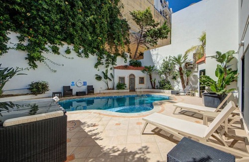 Enjoy a stunning outdoor area featuring a private pool, comfortable deckchairs, and an outdoor dining table—perfect for soaking up the Maltese sun.