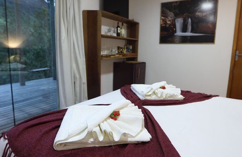 But the real highlight is the veranda, which offers a stunning wooded view where you can relax in the spacious horizontal hammock, enjoying the fresh mountain breeze and the natural wonders that surround the site. To complete your relaxing experience, a beautiful hydromassage awaits you, ideal for enjoying moments of tranquillity under the starry sky of Itatiaia.