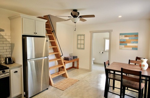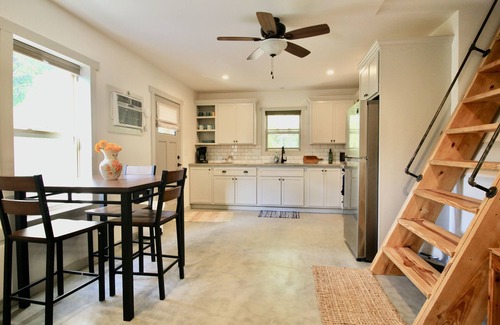 This is a garage apartment bungalow in beautiful Campobello SC, 5 miles to Main Street in Landrum SC, 25 minutes to downtown Spartanburg, 40 minutes to downtown Greenville SC, and about 45 minutes to Asheville NC. Many small North Carolina towns like Tryon, Saluda, Columbus, and Hendersonville are 15 minutes to 40 minutes away. Chimney Rock is about 45 minutes away. Harmon Field with all its beautiful amenities is a 12 minute drive. Inside the unit, downstairs is the kitchen offering concrete counters, under cabinet lighting, stainless appliances (gas range, full refrig, microwave, air fryer, & coffee pot), a dining area, and an attractive bathroom with a cast iron soaker tub. Upstairs is the spacious loft area with 4 different bed options (A queen, two twins, and a double mattress on the floor). The grounds include an orchard, gardens, a few chickens, and some walking paths. You can cycle around Landrum SC or on any of the country roads here. **The stairs to the loft are a sturdy ship-ladder style and all beds are upstairs(See photos).**