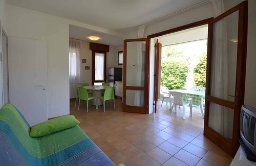 The bungalow is furnished in a functional and typical country style. The property is located in a holiday home settlement. Available for use: barbecue facilities and terrace.LocationBibione. The bungalow is located on a garden plot. The landlord does not live in the house or on the property. The bungalows VEN BIB 189, VEN BIB 548, VEN VEN 221, VEN BIB 434 (6 persons each) are located in the same complex Access is via a side road (asphalted). Parking is available on the property. Specialair conditioning. TV reception takes place via satellite.For your safety, the accommodation is equipped with CO2 detector and fire extinguisher. Dogsallowed, EUR 40.00/pet per stay. DistancesShopping 150 m, restaurant 100 m, town center 50 m. thermal bath in Bibione 5 km. Harbour 400 m. In summer: Adriatic Sea 200 m in Bibione (beach 200 m in Bibione featuring sand). DivisionBungalow, 1 floor, 3 rooms (including 2 bedrooms), 45 sqm, in total 6 beds (including 2 additional beds), on request additionally 1 child up to 2 years in a baby cot. RoomThe entrance to your bungalow is located on the ground floor. Bedroom with 2 single beds. Bedroom with 1 double bed and 1 baby cot. Living/bedroom with 2 additional beds on double sofa bed, TV and access to the terrace (covered). Kitchenette in the living & bedroom with gas stove, fridge, microwave and coffee machine. Bathroom with shower and WC. Terms of lease and pricesIncluded in the priceair conditioning, parking place, electricity, gas, water, heating, final cleaning, beach service (1 sunlounger, 1 chair, 1 parasol). Side costs-Costs on the spot:/Obligatory:final cleaning of the kitchen to be carried out individually. local tax by local tariff (if charged).On request:bed linen 11 € per person per first time use and changing. hand towels 10 € per person per first time use and changing. baby cot – please order at booking 5 € per bed per day. high chair - please order at booking 3 € per piece per day. buggy 3 € per piece per day.Deposit:EUR 100,-/object
