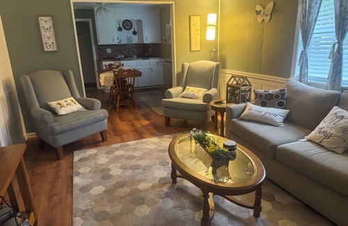 Discover Butterfly Crossing ! the beauty of The South ! In Cartersville come see this 1940’s delightful 2-bedroom cottage In the outskirts of town, Where you can retreat to approx an acre of Rustic beauty that offers a queen bed, a twin bed, and a cozy twin sofa bed love seat for a tremendous night's sleep. Enjoy the relaxing front porch & back deck with a table/chairs & Grill ! along with many other amenities like WiFi full kitchen and a Washer/Dryer. You will find a small indoors book & games Library & outside firepit. Be Sure to check out the chest on the front porch full of yard games for all ages! There’s also a wonderful desk and lamp with USB ports for the remote workers ! If you are looking for modern with all the luxury amenities, this is not your place!!! if you’re looking for comfort, relaxation enjoyment away from the crowds yet close enough to town this right here is your place! This old beauty charm will Awe you ! Come be our guest