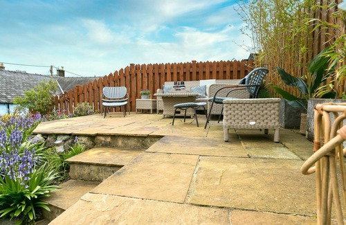 Enter through the porch into a beautifully appointed living area with large comfy sofas around a wood burning stove to one end and the dining area to the other. Stairs lead upstairs to the two chic bedrooms, one of which has a luxurious wet room to boot. Back downstairs, the kitchen is small but perfectly formed with a downstairs bathroom to one side and a sun room with seating to the other. French windows open outside and steps lead up through flower beds to a suprise- a furnished terrace with views over the town out to sea and over the mountains of Eryri beyond. A rare bonus amidst the higgeldy-piggeldy ancient cottages of Beaumaris!
