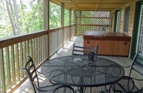 There is a hot tub on the deck, which has a beautiful view of the lake.