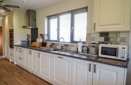 Amenities: Biomass underfloor heating. Electric oven and hob, microwave, fridge, freezer, washing machine, dishwasher. TV with Freeview, DVD player, WiFi. Fuel and power inc. in rent. Bed linen and towels inc. in rent. Cot and highchair available, Off-road parking for 2 cars. Garden with lawn, patio and hot tub. Two well-behaved dogs welcome. Sorry, no smoking. Shop and pub 4 miles. Note: Slight step down from main patio to lawn or side access path. Note: Double sofa bed in lounge. Please see the photos of the rear garden fence; please take care to secure larger dogs in the garden. We respectfully request that all dogs are kept on a lead on site due to proximity to farm livestock.