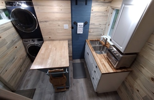 Inside, you'll find a welcoming space with a queen and two twin beds. The full kitchen allows you to prepare hearty meals after a day of exploring. Enjoy sipping on your coffee while you listen to the creek and sink into a relaxing connection to nature.