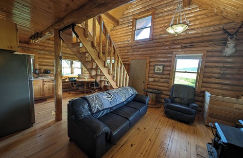 This cozy cabin is 10 miles south of Sheridan looking straight at the Bighorn Mountains. Open floor plan. Bed on main floor with bathroom and kitchen. Laundry attached. East deck to watch the sunrise or an evening BBQ. Second bed upstairs for guests. FYI, there might be couple project trucks or race cars in the adjacent drive way when you pull up...