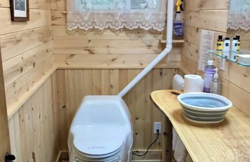 There's no running water in the cabin; two 5-gallon water jugs with hand pump are provided for guests for washing and cooking. Separate bathroom with composting toilet. New for 2024, for the warm months we've added an outdoor shower - with hot running water heated with propane.