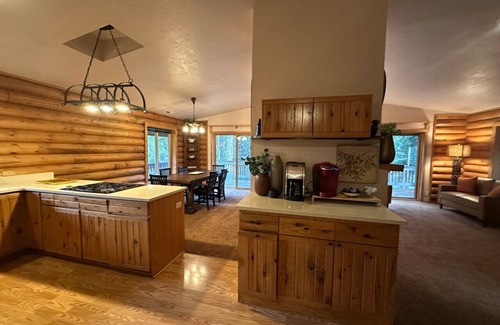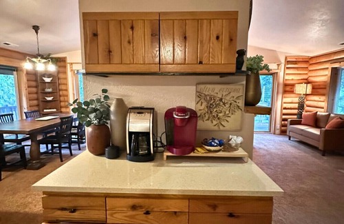 Welcome to our beautiful cabin just 15 minutes from Ashland, conveniently located over the California border in Oregon. Our spacious accommodations feature three bedrooms with comfortable queen beds and an additional bedroom with a cozy bunk bed. The primary bathroom even includes a relaxing sauna for your ultimate comfort. In the morning, start your day off right with your choice of drip or pod coffee from our well-stocked coffee bar.