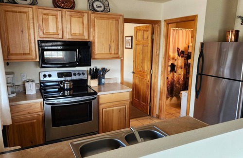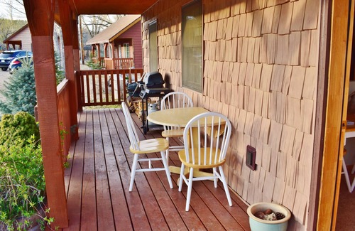 Shaded by cottonwood trees, this neat private cabin has a full kitchen, wood fireplace, a large wooden porch with a table and chairs, BBQ Grill, WiFi, Roku TV, separate bedroom with a queen-size bed, living room with queen-size roll out couch and table and chairs, southwestern artwork, air-conditioning, full bathroom with tub and shower.
