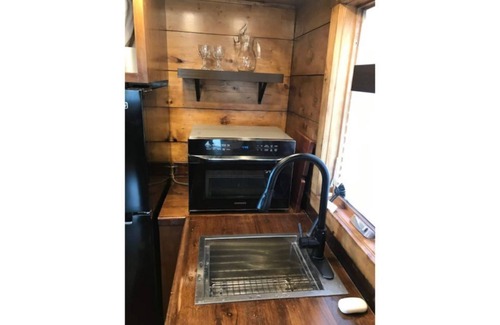 This Tiny Home has a queen size bed in the loft and full size sofa couch on the main floor. There is a TV in main living area with HDMI cable for laptop/computer. There is a microwave/convection oven, cooktop, and refrigerator. A small dining table with two chairs. The home is heated and cooled with a mini-split.