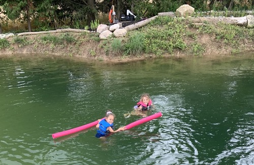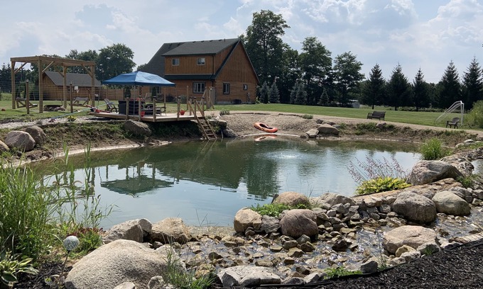Log home on 2 acres surrounded by farmers fields. Lots of privacy. Your own private beach with dock. Outdoor bar, lounge and and floating island for water fun! Comfortably sleeps 12 adults inside and even more outside! Kids and pets welcome :)