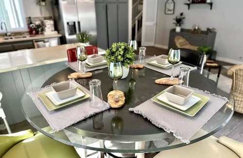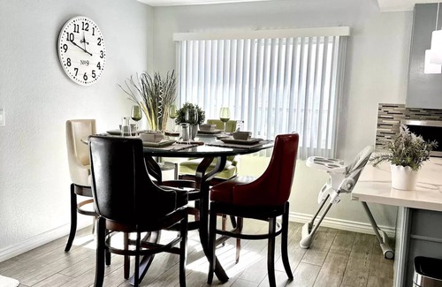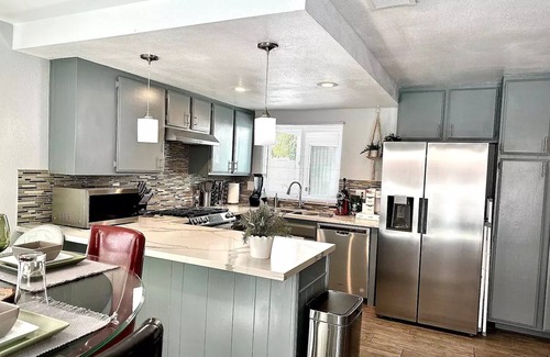 Relax and enjoy your stay in this modern chic newly renovated home. Have fun with family and friends in the garage turned game room and a small golf area in the fully fenced backyard! Enjoy cooking a meal in the fully stocked kitchen or BBQing outside on the grill. You will have 3 separate areas you can enjoy your meals, outside in the backyard or either of the 2 dinner tables inside.This home is STEPS away from Yaamava (San Manuel) Casino and just minutes away from restaurants and grocery store