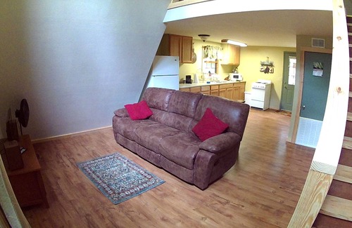 The A-Frame cabin comes complete with oven and 4 burner stove, full size fridge, microwave, toaster, complimentary in room coffee, TV (no cable/sat), DVD only player (there is a shared selection of DVDs, recommend you bring your own if you wish to watch TV), 1 bedroom with a queen bed, second floor loft with a full size bed, 1 bathroom with a stand up shower, fire ring, covered deck with charcoal grill, Wi-Fi available on the property if it is needed. The deck has views of the Caddo River. Distance to the river is about 100 yards down slope.