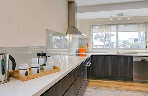 There are also another two bedrooms on the ground floor, one with a queen bed and another with a tri-bunk and bunk bed making this home able to accommodate 11 guests very comfortably. The bathroom downstairs is disability accessible. There is also a laundry complete with washing machine, dryer, ironing board and iron. A Portacot and high chair are available for families with little ones.