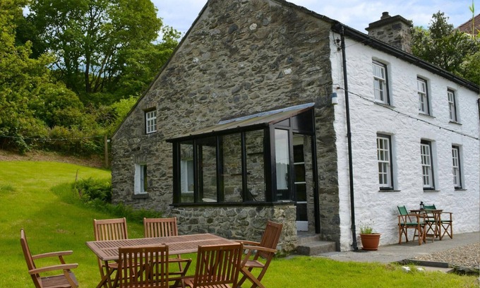 The cottage has a large enclosed garden with attached woodland and stream. The terrace overlooks the beautiful Dyfi estuary, with expansive views down from Cader Idris mountain to the sea at Aberdyfi. A large garage provides safe cycle parking. Off-road parking for up to 3 cars.