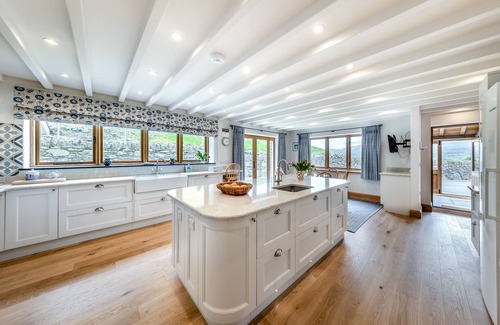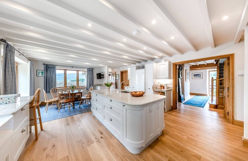 This Grade II-listed farmhouse boasts over four centuries of history, beautifully marrying authentic period charm with modern comforts to ensure an unforgettable visit. The conservatory, a haven of warmth and light, invites guests to bask in the serenity of garden vistas and the distant estuary. At the heart lies the kitchen, a beacon of culinary inspiration, equipped with a Smart TV for your entertainment. You can eat your breakfast at the kitchen table with views of the distant hills, whilst next door is the elegant dining room where you can relax in front of the wood burner casting a gentle light across the room. It is easy to feel a sense of peace and contentment. As evening falls, the lounge becomes a cocoon of relaxation, with its sumptuous seating, a Smart TV and DVD player for state-of-the-art entertainment, and the timeless allure of the inglenook fireplace with its bread oven and another wood burner. There is a plentiful supply of local split logs. Settle in to play bridge, read a book or play a board game. The journey continues upstairs, where a gallery landing leads to a quartet of exquisitely designed bedrooms, each a private retreat into luxury and comfort: two super-king-size with en-suite facilities, a twin room, and another super-king-size bedroom, alongside a family bathroom.