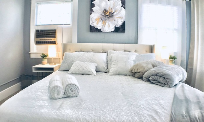 A private unit located near downtown, businesses, and hospitals. Relax in this spacious 1 bed 1 bath unit on the 2nd floor in a grand building with 100-year history. Sleeps up to 4 guests with a King bed and two floor mattresses. Fully furnished with a 55" smart TV with Prime Video, new retro refrigerator, microwave, coffee maker, washer/dryer, and kitchen/bath room essentials.
