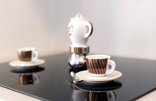 The dining area is designed for memorable dinners, with a large dining table for 4 people, illuminated by soft lighting to create an intimate atmosphere. The modern kitchen is fully equipped with induction hob, fridge and freezer, coffee machine with pods available, and a complete set for making tea with electric kettle. Shelves and cooking utensils are provided to ensure an unparalleled dining experience.