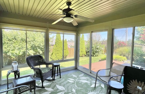 The sunroom in the back of the house is connected to our enclosed backyard where our guests will find a koi pond and quiet and peace.