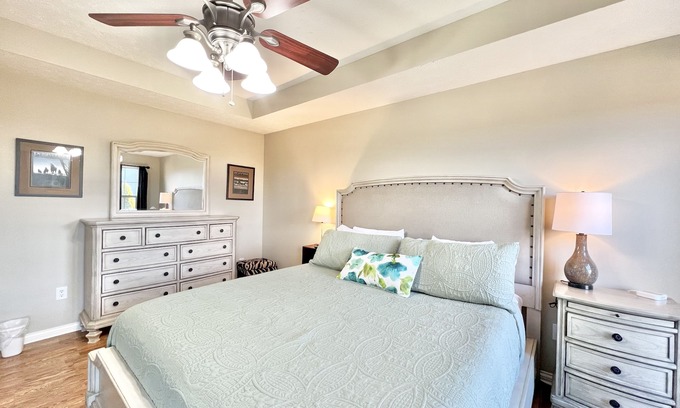3 Bedrooms. Two with Cali king mattress and 1 with a full size trundle bed with twin bed that rolls out from underneath.