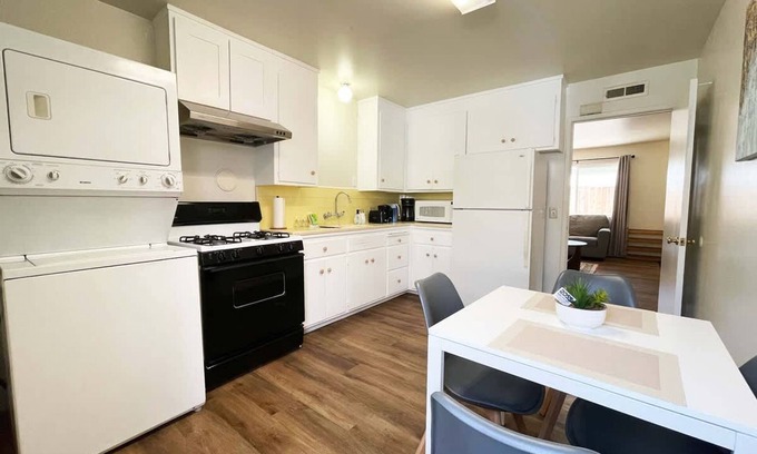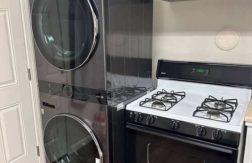 GeneralElectric kettle, Number of bedrooms - 2, Spices, Designer toiletries, Stovetop, Bathtub only, Kitchen, No rollaway/extra beds, Iron/ironing board, Television, Bed count minimum 2, Toaster, Bed sheets provided, Hair dryer, Free WiFi, Digital TV service, Coffee/tea maker, Microwave, Dryer, Laptop-friendly workspace, Towels provided, Air conditioning, Number of bathrooms - 1, Cookware, dishware, and utensils, Washing machine, Private bathroom, Heating, No cribs (infant beds), Oven, Refrigerator, Bed count maximum 2 |