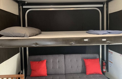 Our place Sleeps 5 (1 queen bed, 1 futon, and a bunk bed (180 lbs max) that lowers from the ceiling). Air conditioning/heating, full kitchen with stove, convection/microwave oven, refrigerator, freezer and a Keurig Coffee Maker. A TV is provided in both the bedroom and livingroom. You have a nice standup shower. You have a DVD player with Indoor/outdoor speaker system for playing music and a fire pit is also provided. Free Hulu and Disney.