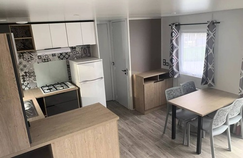 Details: Wi-Fi access : supplement - possible on the entire campsite Accessible by train : Challans (4.9 km) Playground for children : yes Family animations : various activities offered by the campsite during the day and evening July/August: pony or horse ride that will delight the little ones (free access) Pets allowed : With extra charge. Category 1 and 2 not allowed - only 1 animal per rental - For dogs over 10 kg a compulsory cleaning package Deposit (in supplement) : 300 Final cleaning fee : additional fees and on-site settlement Baby Kit : 18€ per week upon request and reservation Bedding : supplement Towels : supplement Mini golf : accessible all year round Number of stars : 3 bowling Ping Pong : yes Indoor swimming pool : heated pool from 15 April to 31 October 2024 Close trade : 2 minutes by car Restaurant : In July and August, snack bar, bread deposit, takeaway pizzas, paninis, pancakes Tourist tax (surcharge) : in mobile home 0.45€:night and per adult or 0.67€ in gite per night and per adult - to be paid on site Swimming pool Sports animations Pets Allowed : With supplement - Tenus on leash Air conditioner Bedding Number of bedrooms : 2 Number of pieces : 3 Number of bathroom : 1 Napkins Surface (m²) : 36 Television Terrace Cooked Number of toilets : 1 Barbecue