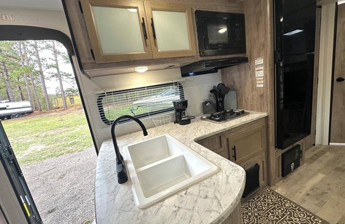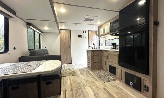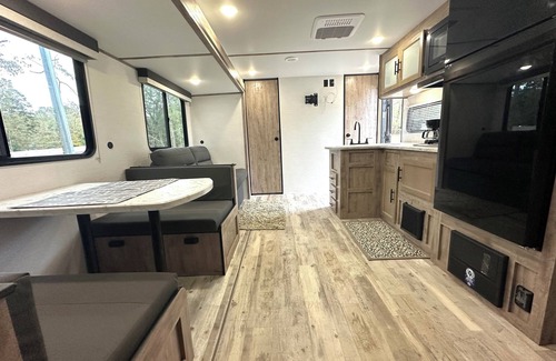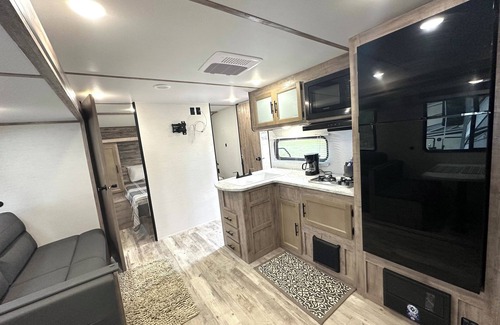 Choose your campground, free delivery for up to 45 miles. Enjoy nature with this enchanting cozy Camper with a charming living room, sofa bed and two bunk beds. Kitchen has refrigerator, microwave, pots and pans. AC for your comfort, guests can unwind and enjoy the marvelous outdoors. Make your holiday one for the books with a stay at our place.