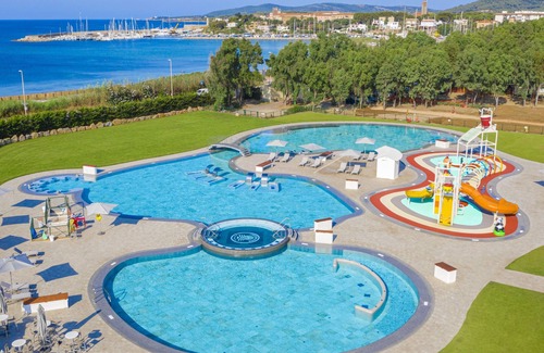 Child friendly resort "Camping Village Laguna Blu". 100 houses in the resort. 5 km from the centre of Alghero, 1 km from the centre of Fertilia, 35 km from the centre of Sassari, 50 m from the sea, 50 m from the beach, road to cross. For shared use: property 15'000 m2 (fenced) with plants and trees, swimming pool (1'500 m2, depth 125 - 125 cm, seasonal availability: 26.May. - 29.Sep.). Children's pool, slide, barbecue, children's playground. In the complex: reception, restaurant, bar, WiFi (extra). Fitness room, shopping facilities, washing machine, tumble dryer (for shared use, extra), bicycle rental. Breakfast full board half board possible (extra). Bakery 100 m, bus stop 1 km, ferry "Porto Torres" 37 km, sandy beach 50 m. Please note: entertainment in the season. Suitable for families. Obligation to wear bathing caps. Airport Alghero 5 km.