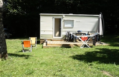 Accommodation: These non-water-powered mobile homes are installed on the family area, close to the sanitary block. Ideal for families with young children these vintage mobile homes are equipped with nine! Come and discover the joys of camping for the pleasure and tranquility of the whole family. In the 2 rooms, duvets, pillows and disposable alesis are provided. 2 bunk beds (80 x 180) in the children's room. The dining area is equipped with 2 benches, a table, a refrigerator, 2 gas hobs, an electric coffee maker, a microwave, all the kitchen battery and dishes. The large shaded terrace is equipped with deckchairs, a garden furniture and a gas barbecue.All comfort for a true return to nature!