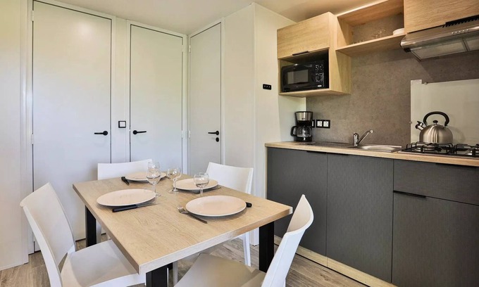 Details: Disabled access : yes Wi-Fi access : Supplement Playground for children : Free Family animations : From 06/07/2024 to 01/09/2024 Sports animations : From 06/07/2024 to 01/09/2024 Pets allowed : Authorized dog (excluding 1st and 2nd cat.) - Additional Barbecue : gas - authorized Kids club : 4 - 12 years (Languages spoken : French) Deposit of bread : All season Grocery store : All season Baby Kit : Free Laundromat : Supplement Bedding : Supplement Towels : Supplement Number of stars : 3 bowling : Free Ping Pong : Free Swimming pool : 2 Near airport : Bordeaux-Mérignac Airport #BOD (190.0 km) Restaurant : All season Snack bar : All season Tourist tax (surcharge) : On-site tariff and regulation Multisports ground Green key Number of bathroom : 1 Cooked Garden Lounge : 1 Number of bedrooms : 2 Air conditioner Number of double bed : 1 Number of pieces : 3