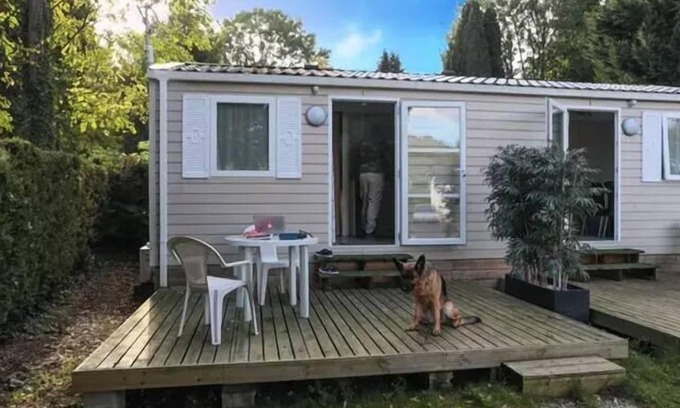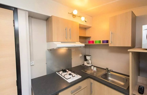 Accommodation: This mobile home has a reversible air conditioning TOP OF GAMME and flat screen TV! It consists of a bedroom with a double bed 140 x 190 cm, and a convertible sofa. There are pillows, mattress and duvet protection, a bathroom with shower, washbasin and toilet, a main room with kitchenette and dining area with bench and chairs. Equipped with a flat-screen TV, dishes, kitchenware, microwave, coffee maker, terrace, garden furniture, deckchairs, refrigerator and gas hob.This accommodation is attached to another mobile home.