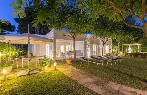 The 1,150 m² green plot is completely fenced and created with Mediterranean plants and trees, which gives you a very private idyllic. The outdoor area is designed with lots of green space, which will delight children's hearts very much. The beach is just 20 meters away and is an absolute plus for families with children, as you can quickly catch up on all the essentials of beach equipment. For those who prefer to chill out in the garden, the comfortable sun loungers or the comfortable lounge area are the perfect choice. The barbecue area is very spacious and equipped with its own kitchen. The integrated stone benches and the large wooden table provide space for the whole travel group. There are also other possibilities to eat outside, for example under another covered terrace or directly in the garden under the parasol. The outdoor area is more reminiscent of a well-kept park with all its different benches and stone paths that lead you through the garden. If you come from the beach are a complete bathroom and 2 shower rooms available, so you do not drag the sandy beach into the house.