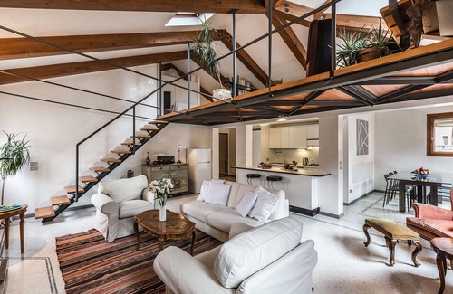 It measures about 100 square meters and it is composed of a luminous and very spacious loft-style living room with high ceilings and mezzanine level that leads to the roof-top terrace; a functional and well-equipped open space kitchen with 4 gas burners stove, dishwasher, fridge, freezer, oven, kettle, etc; a bright dining area with a glass table for up to 6 people; a spacious double bedroom with a large walk-in wardrobe; a modern bathroom with large shower cabin; a small laundry room.