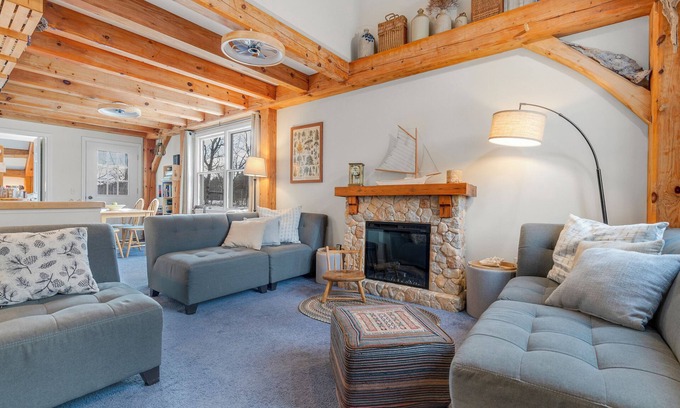 This charming 2-bedroom, 2-bathroom post-and-beam condo is the perfect retreat for your next mountain getaway. Located just 5 minutes from Sunday River, this cozy unit features an inviting living area with a fireplace, ideal for warming up after a day on the slopes. Step out onto the private balcony to enjoy scenic views of the surrounding area. The entryway includes convenient gear storage to keep your outdoor equipment organized.