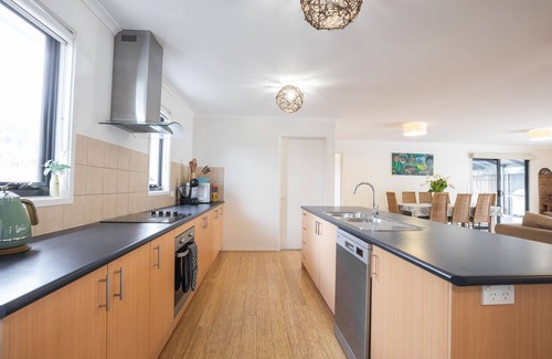 There is a central dining table with seating for 8 plus an extendable table with additional chairs and five bar stools at the kitchen bench, so there will be seating ample dining seating for everyone. The kitchen is modern and well equipped with ample crockery and cutlery for up to 16 guests. There is an electric oven and hot plates, a microwave oven and a dishwasher. Everything has been considered. There is a huge double door fridge/freezer and a separate fridge and plenty of platters and salad bowls for alfresco dining on the deck.
