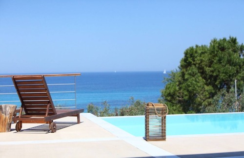 Being on a slightly elevated level, 50m from the sea, the house offers superb views across the water whether from the comfortable armchairs on the terrace or one of the sunbeds on the decking of the swimming pool or even inside the infinity swimming pool