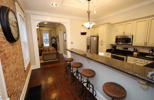 Welcome to Captain’s Quarters—where historic charm meets modern comfort! Built in the late 1800s, this beautifully restored home blends the rich heritage of Kentucky—horses, steamboats, and the bourbon trail—with today’s conveniences. Enjoy a well-stocked bar in the living room for mixing up your favorite drinks and a game room in the basement with an air hockey table and an arcade machine featuring 400+ games!