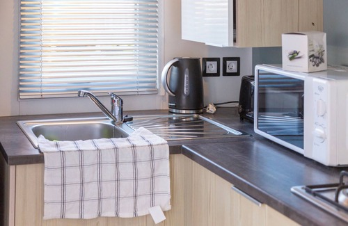 Located in Pont-Aven, this 36 sqm mobile home on the Siblu holiday village accommodates up to 6 guests. You will find 2 bedrooms, a living room with a convertible corner sofa for 2 people, and a dining area. The well-equipped private kitchen, bathroom with shower, and separate WC provide all necessary conveniences. Wi-Fi, TV, grill, and convectors in each room ensure your comfort during your stay.