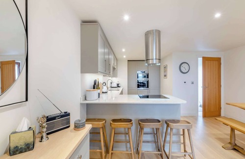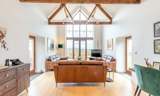 Bathroom: Bath With Shower Over, Toilet. Air source heat pump central heating, electricity, bed linen, towels and Wi-Fi included. Travel cot and highchair. Welcome pack. . Front garden with garden furniture. Bike store. Electric vehicle charging point (£50 per week). Private parking for 2 cars (no vans, campervans or caravans). No smoking.. With breath-taking views from the arch windows and fabulous attention to detail throughout, this truly is a wonderful countryside retreat for families, friends, or couples to enjoy some relaxation together, spending time within an area of tranquillity but close enough to all amenities. Haybale Barn is set on a small new development of converted farm buildings and has plenty of cosy seating, high open beamed ceilings, and a large dining table to gather after cooking in the well-equipped kitchen. Downstairs you will find two double bedrooms with outstanding views, one of which has an en-suite walk-in shower room. Head upstairs where there are a further two well-presented bedrooms, comprising of a king size bedroom with another en-suite walk-in shower room, and a triple bedroom, each promising a delightful space to wake up to each morning. Upstairs is the main family bathroom with a modern bath and overhead rain shower. Head outside to the garden with outstanding uninterrupted views over the Cheviot Hills, a truly idyllic sun trap. Enjoy some al fresco dining whilst watching the sunset – a view you will never forget!