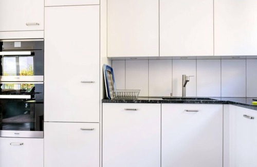 "Carina Lakeview", 5-room house 130 m2. Spacious and bright, comfortable and rustic furnishings: open large living/dining room 60 m2 with panoramic window with open-hearth fireplace, dining table, library, cable TV and international TV channels (flat screen), DVD and DVD collection available. Exit to the garden, to the terrace, to the patio. 1 double bedroom with 2 beds (100 cm, length 200 cm). Exit to the terrace. 1 room with 2 beds (90 cm, length 200 cm). Exit to the terrace. 1 double bedroom with 1 double bed (180 cm, length 200 cm). Exit to the terrace. 1 room with 1 x 2 bunk beds (90 cm, length 200 cm). Large, open kitchen (oven, dishwasher, 3 induction hot plates, toaster, kettle, freezer, electric coffee machine, Capsules for coffee machine (Nespresso) extra, steamer, raclette grill, fondue Set (chinoise, cheese)). Bath/WC, shower/WC, sep. WC. Electric heating, oil heating. Large terrace partly roofed. Barbecue, deck chairs (6). Marvellous panoramic view of the lake, the mountains and the countryside. Facilities: iron, children's high chair, baby cot for up to 2 year olds, hair dryer. Internet (WiFi, free). Please note: non-smoking house. Maximum 2 pets/ dogs allowed. 4409