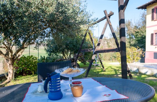 Rustic 2-family house, 2 storeys, surrounded by meadows and fields. In the district of Penango, 3 km from the centre of Moncalvo, in a quiet, sunny position. For shared use: property 1'500 m2 (fenced), garden with meadow. In the house: washing machine. Parking at the house on the premises. Shop 3 km, supermarket 3 km, bus stop 6.1 km. Nearby attractions: Asti 20 km, Alba 50 km, Turin 80 km. Please note: car recommended. The owner has a dog.