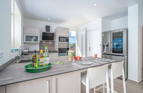 The living space will charm you with its aesthetics, comfort, and functionality. Modern, the kitchen area offers the privilege of cooking facing the sea. Its bar, equipped with stools, is a true place of conviviality. Bright, the living room and dining area are widely open to the outside, offering a splendid panoramic view where the pool, the sky, and the sea seem to blend together.The Villa Carpe Diem can accommodate up to six people thanks to its three air-conditioned bedrooms, each with its own shower room and private toilet. The main bedroom, furnished with a 160x200 bed, opens onto a terrace offering a magnificent view of the pool and the blue expanse of the ocean. The other two bedrooms, comfortably located upstairs, also offer a view of the sea: the first is equipped with a 160x200 bed, the second has two beds measuring 90x190.