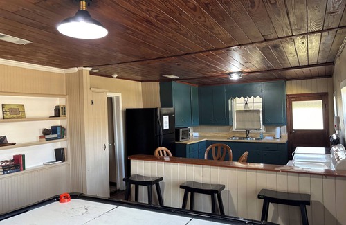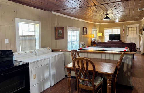 The Carriage House sleeps nine comfortably. Three full beds, three twins and one pull down Murphy bed. Two full baths, one tub/shower and one shower. Washing machine and dryer but no dishwasher. Free WiFi and air hockey table.