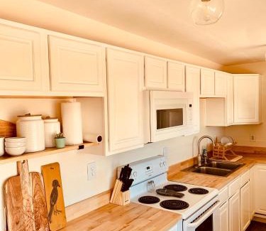 Food & DrinkTea/Coffee maker, Bottle of waterBathroomBody soap, Shower, Shampoo, Towels, Conditioner, Private bathroom, Free toiletries, Hairdryer, Bathtub or shower, Toilet paper, Toilet, BathtubMedia & TechnologyStreaming service (like Netflix), TV, Flat-screen TVGeneralAir conditioning, Carbon monoxide detector, Soundproof, Trash cans, Heating, Private entrance, Smoke Alarm, Fan, Fire extinguisher, Key accessKitchenMicrowave, Stovetop, Refrigerator, Electric kettle, Dining table, Kitchen, Cleaning products, Washing machine, Wine glasses, Oven, Dryer, Kitchenware, ToasterLiving AreaDining area, Sofa, Sitting areaOutdoorsBarbecue, Patio, Outdoor furnitureBedroomWardrobe or closet, Extra long beds (> 6.5 ft), LinensViewMountain view, ViewAccessibilityEntire unit located on ground floorRoom AmenitiesSocket near the bed, Hypoallergenic pillow, Drying rack for clothing, Non-feather pillow, Adapter, Feather pillow, Clothes rack, Sofa bedEntertainment & Family ServicesBoard games/puzzlesPhysical distancingSingle-room AC for guest accommodationCleanliness & disinfectionHand sanitizer |
