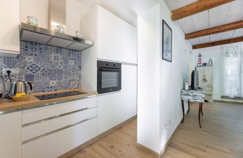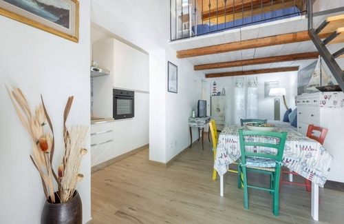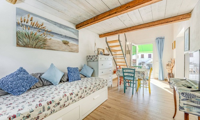 Comfortable and modern, the apartment has been recently renovated; very well finished with private covered parking space in high season. Independent entrance on the ground floor; you enter this wonderful living area with well-equipped kitchen and sofa bed with TV. The sleeping area is located on the wooden mezzanine with exposed beams. Modern bathroom with shower.